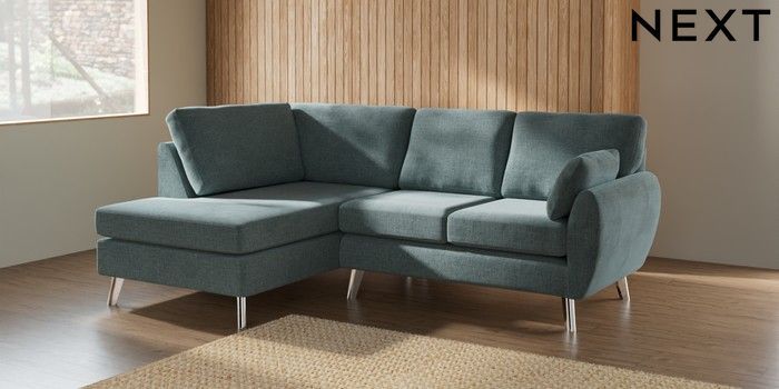 7.2.10 Buy Wilson Medium Corner Chaise - Left Hand Chunky Chenille Light Teal Green Metal Tapered - Chrome from the Next UK online shop Click here to use our accessible website