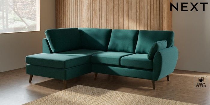 7.3.1 Buy Wilson Medium Corner Chaise - Left Hand Fine Chenille Easy Clean Dark Juniper Green Retro Tapered - Mid from the Next UK online shop Click here to use our accessible website