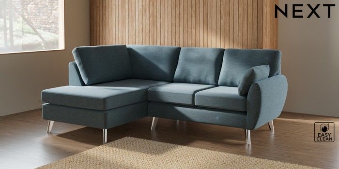7.2.10 Buy Wilson Medium Corner Chaise - Left Hand Fine Chenille Easy Clean Mid Blue Metal Tapered - Chrome from the Next UK online shop Click here to use our accessible website