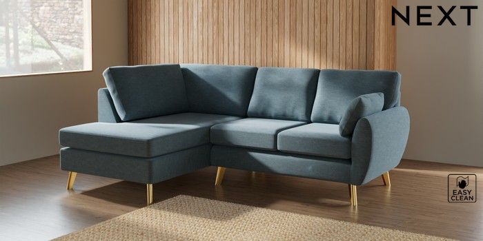 7.3.1 Buy Wilson Medium Corner Chaise - Left Hand Fine Chenille Easy Clean Mid Blue Metal Tapered - Gold from the Next UK online shop Click here to use our accessible website