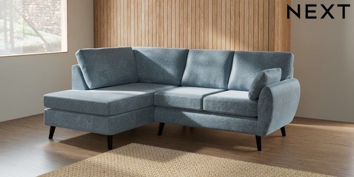 7.2.6 Buy Wilson Medium Corner Chaise - Left Hand Plush Chenille Light Blue Retro Tapered - Dark from the Next UK online shop Click here to use our accessible website