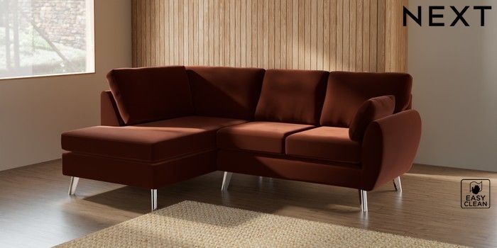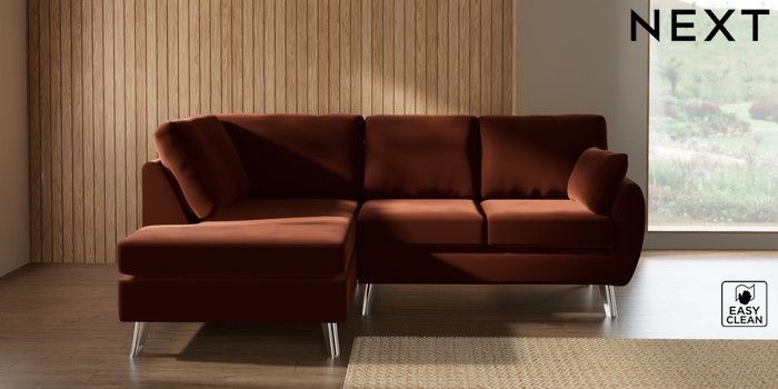 7.3.1 Buy Wilson Medium Corner Chaise - Left Hand Plush Velvet Easy Clean Ginger Orange Metal Tapered - Chrome from the Next UK online shop
