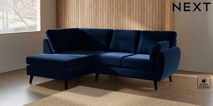 7.3.1 Buy Wilson Medium Corner Chaise - Left Hand Plush Velvet Easy Clean Navy Blue Retro Tapered - Dark from the Next UK online shop