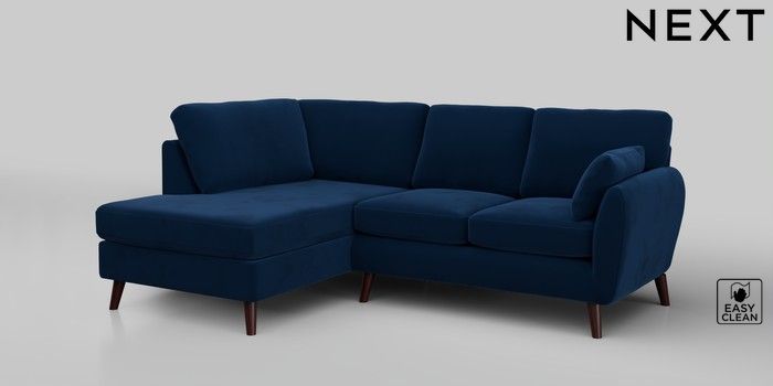 6.12.1 Buy Wilson Medium Corner Chaise - Left Hand Plush Velvet Easy Clean Navy Blue Retro Tapered - Dark Brown from the Next UK online shop Click here to use our accessible website