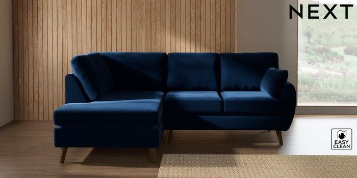 7.3.1 Buy Wilson Medium Corner Chaise - Left Hand Plush Velvet Easy Clean Navy Blue Retro Tapered - Mid from the Next UK online shop