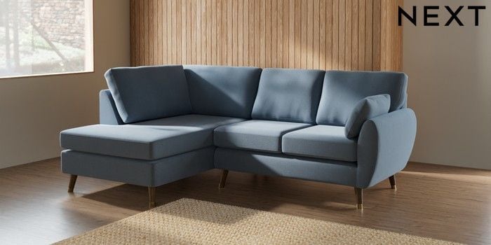 7.3.1 Buy Wilson Medium Corner Chaise - Left Hand Relaxed Linen Look Mid Blue Low Retro Tapered Metal Cap - Mid from the Next UK online shop Click here to use our accessible website