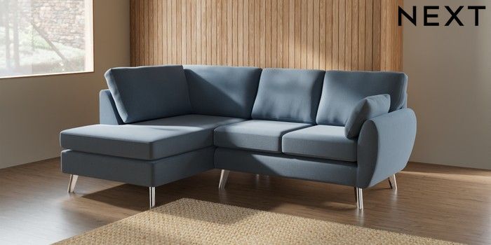 7.3.1 Buy Wilson Medium Corner Chaise - Left Hand Relaxed Linen Look Mid Blue Metal Tapered - Chrome from the Next UK online shop Click here to use our accessible website