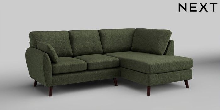 6.12.1 Buy Wilson Medium Corner Chaise - Right Hand Boucle Chenille Dark Moss Green Retro Tapered - Dark Brown from the Next UK online shop Click here to use our accessible website
