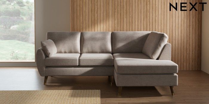 7.3.1 Buy Wilson Medium Corner Chaise - Right Hand Boucle Chenille Light Natural Low Retro Tapered Metal Cap - Mid from the Next UK online shop Click here to use our accessible website
