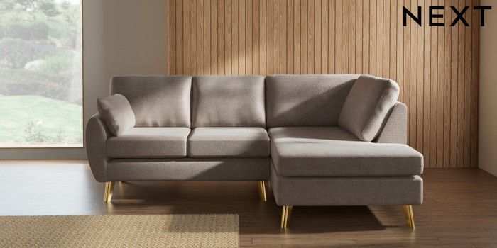 7.3.1 Buy Wilson Medium Corner Chaise - Right Hand Boucle Chenille Light Natural Metal Tapered - Gold from the Next UK online shop Click here to use our accessible website