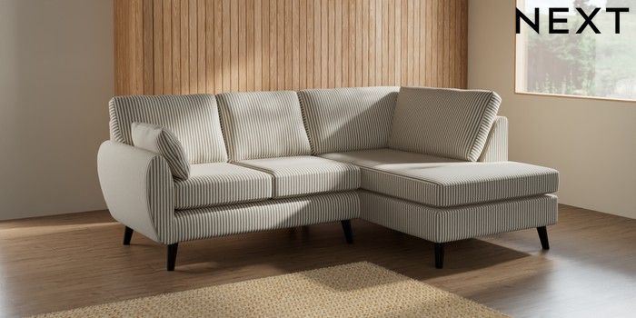 7.2.10 Buy Wilson Medium Corner Chaise - Right Hand Chenille Stripe Moss Green Retro Tapered - Dark from the Next UK online shop Click here to use our accessible website