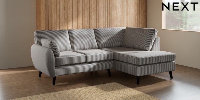 7.2.10 Buy Wilson Medium Corner Chaise - Right Hand Chenille Stripe Slate Blue Retro Tapered - Dark from the Next UK online shop Click here to use our accessible website