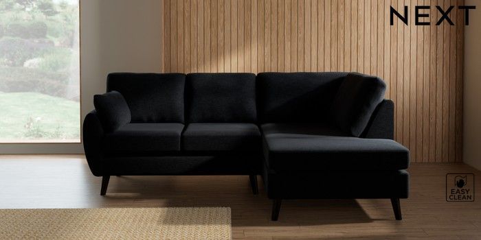 7.3.1 Buy Wilson Medium Corner Chaise - Right Hand Fine Chenille Easy Clean Black Retro Tapered - Dark from the Next UK online shop