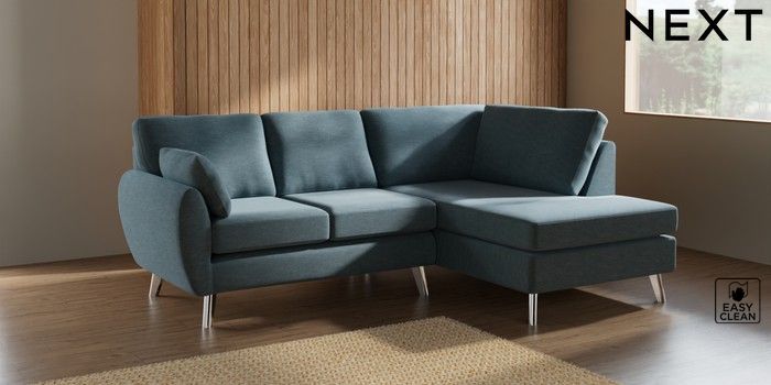 7.2.10 Buy Wilson Medium Corner Chaise - Right Hand Fine Chenille Easy Clean Mid Blue Metal Tapered - Chrome from the Next UK online shop Click here to use our accessible website