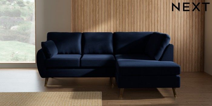 7.3.1 Buy Wilson Medium Corner Chaise - Right Hand Luxe Chenille Navy Blue Low Retro Tapered Metal Cap - Mid from the Next UK online shop