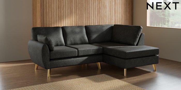 7.3.1 Buy Wilson Medium Corner Chaise - Right Hand Plush Chenille Dark Grey Metal Tapered - Gold from the Next UK online shop Click here to use our accessible website
