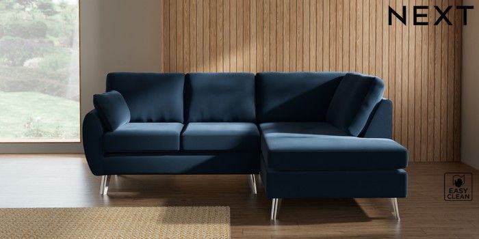 7.3.1 Buy Wilson Medium Corner Chaise - Right Hand Plush Velvet Easy Clean Airforce Blue Metal Tapered - Chrome from the Next UK online shop