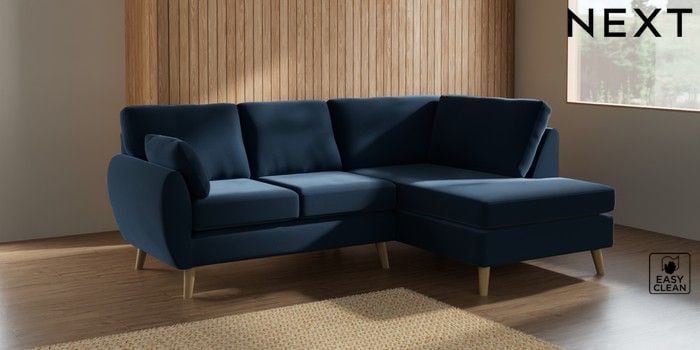 7.3.1 Buy Wilson Medium Corner Chaise - Right Hand Plush Velvet Easy Clean Airforce Blue Retro Tapered - Light from the Next UK online shop Click here to use our accessible website