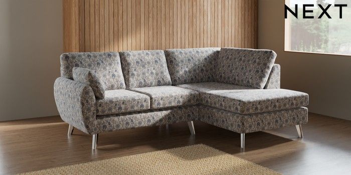 7.2.10 Buy Wilson Medium Corner Chaise - Right Hand Relaxed Linen Look Print Woodblock Floral Blue Metal Tapered - Chrome from the Next UK online shop Click here to use our accessible website