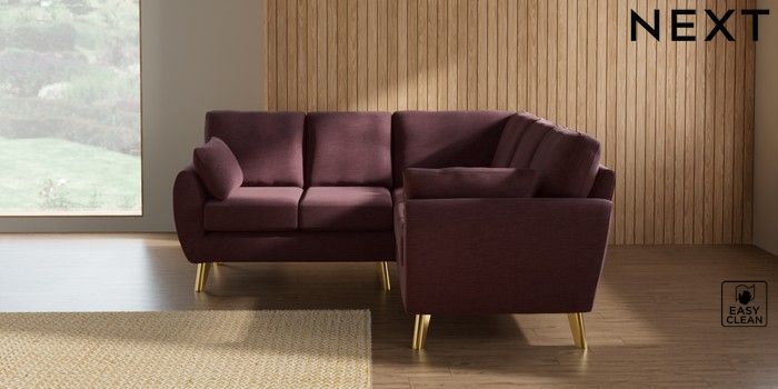 7.3.1 Buy Wilson Small Corner Sofa - Universal Fine Chenille Easy Clean Mid Mulberry Purple Metal Tapered - Gold from the Next UK online shop Click here to use our accessible website