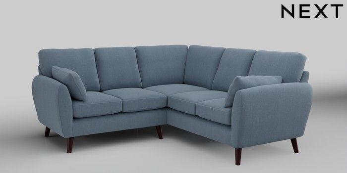 6.12.1 Buy Wilson Small Corner Sofa - Universal Relaxed Linen Look Mid Blue Retro Tapered - Dark Brown from the Next UK online shop Click here to use our accessible website