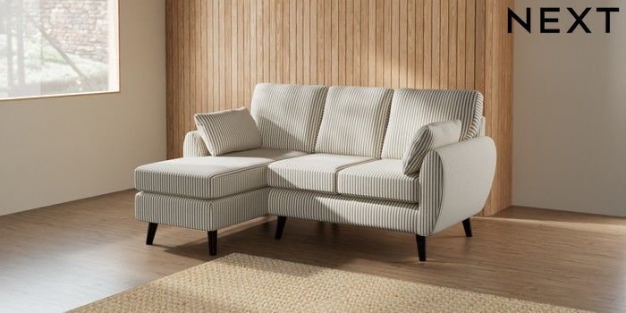 7.2.10 Buy Wilson Small Sofa Chaise - Left Hand Chenille Stripe Moss Green Retro Tapered - Dark from the Next UK online shop Click here to use our accessible website