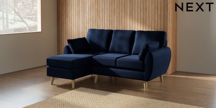 7.2.10 Buy Wilson Small Sofa Chaise - Left Hand Luxe Chenille Navy Blue Retro Tapered - Light from the Next UK online shop Click here to use our accessible website
