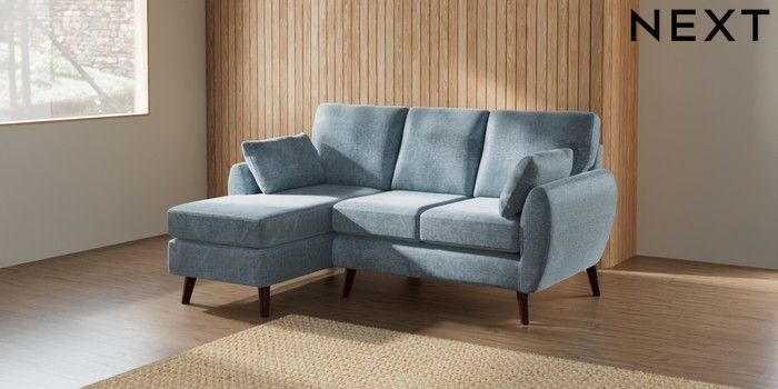 7.2.6 Buy Wilson Small Sofa Chaise - Left Hand Plush Chenille Light Blue Retro Tapered - Dark Brown from the Next UK online shop Click here to use our accessible website