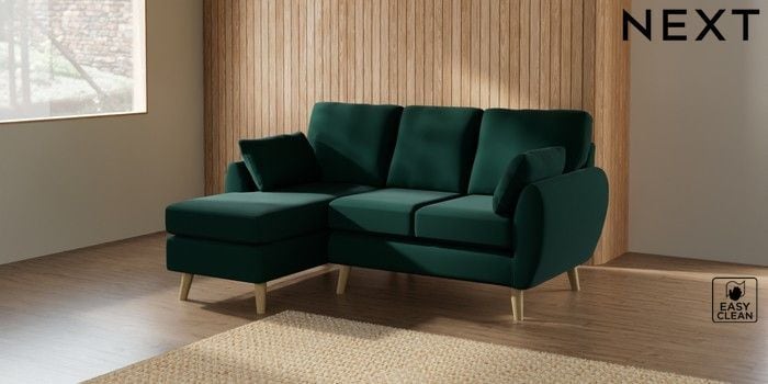 7.3.1 Buy Wilson Small Sofa Chaise - Left Hand Plush Velvet Easy Clean Bottle Green Retro Tapered - Light from the Next UK online shop Click here to use our accessible website