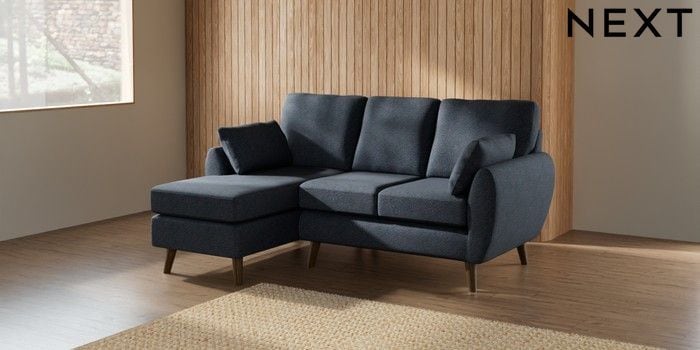 7.2.10 Buy Wilson Small Sofa Chaise - Left Hand Tweedy Chenille Navy Blue Retro Tapered - Mid from the Next UK online shop Click here to use our accessible website