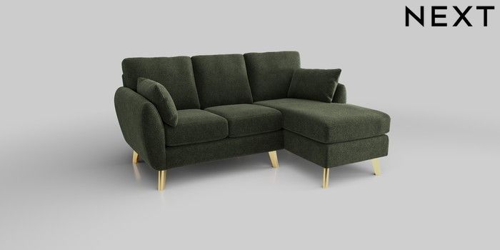 6.12.1 Buy Wilson Small Sofa Chaise - Right Hand Boucle Chenille Dark Moss Green Metal Tapered - Gold from the Next UK online shop Click here to use our accessible website