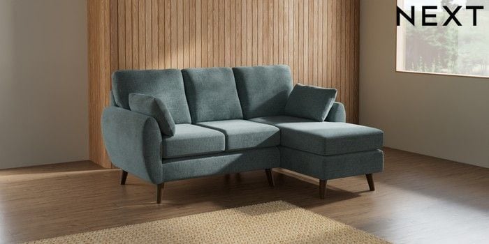 7.2.10 Buy Wilson Small Sofa Chaise - Right Hand Chunky Chenille Light Teal Green Retro Tapered - Mid from the Next UK online shop Click here to use our accessible website