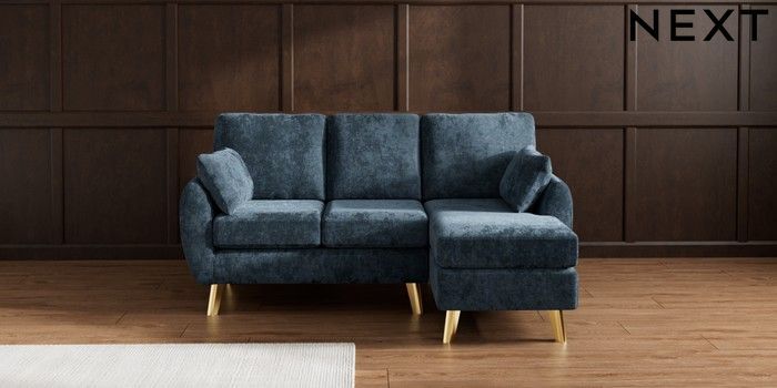 7.3.1 Buy Wilson Small Sofa Chaise - Right Hand Distressed Velour Midnight Blue Metal Tapered - Gold from the Next UK online shop Click here to use our accessible website