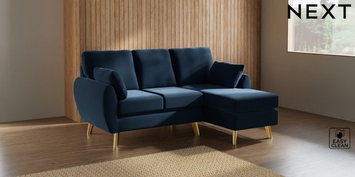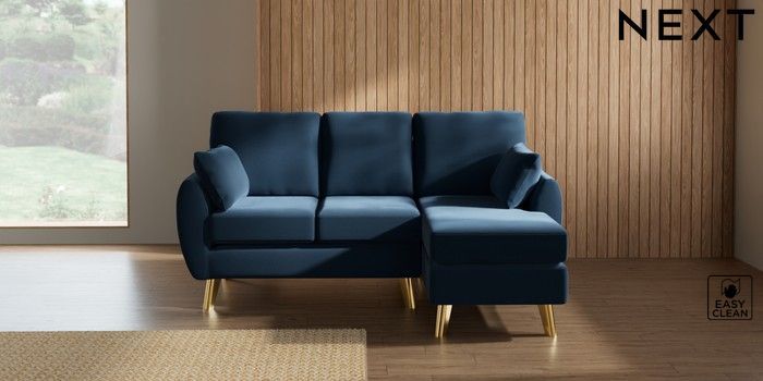 7.3.1 Buy Wilson Small Sofa Chaise - Right Hand Plush Velvet Easy Clean Airforce Blue Metal Tapered - Gold from the Next UK online shop Click here to use our accessible website