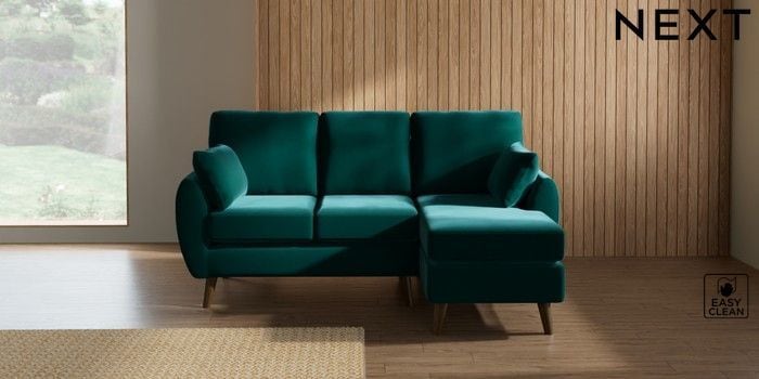 7.3.1 Buy Wilson Small Sofa Chaise - Right Hand Plush Velvet Easy Clean Juniper Green Retro Tapered - Mid from the Next UK online shop Click here to use our accessible website