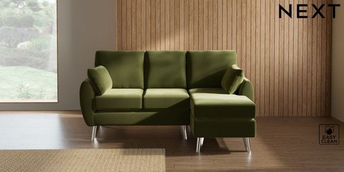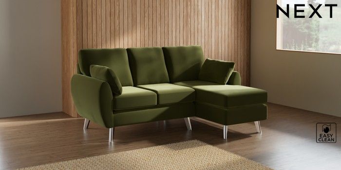 7.3.1 Buy Wilson Small Sofa Chaise - Right Hand Plush Velvet Easy Clean Mid Olive Green Metal Tapered - Chrome from the Next UK online shop Click here to use our accessible website