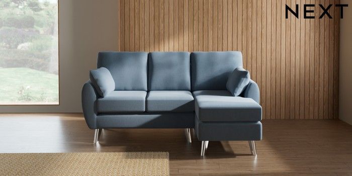 7.3.1 Buy Wilson Small Sofa Chaise - Right Hand Relaxed Linen Look Mid Blue Metal Tapered - Chrome from the Next UK online shop