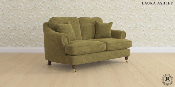 7.0.3 Buy Ambersham by Laura Ashley 2 Seater Small Sofa Alwyn Velvet Olive Green Low Brass Castor - Chestnut from the Laura Ashley online shop Click here to use our website with more accessibility support, for example screen readers