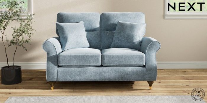 7.2.6 Buy Ashford Highback 2 Seater Small Sofa Plush Chenille Light Blue Modern Turned Metal Cap - Mid from the Laura Ashley online shop Click here to use our website with more accessibility support, for example screen readers