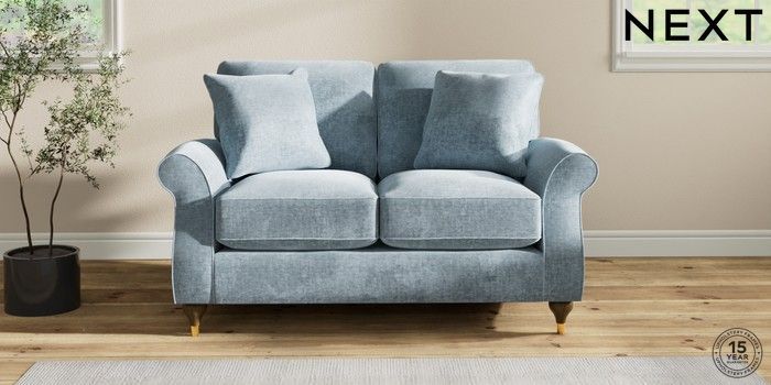 7.2.6 Buy Ashford Relaxed Sit 2 Seater Small Sofa Plush Chenille Light Blue Modern Turned Metal Cap - Mid from the Laura Ashley online shop Click here to use our website with more accessibility support, for example screen readers