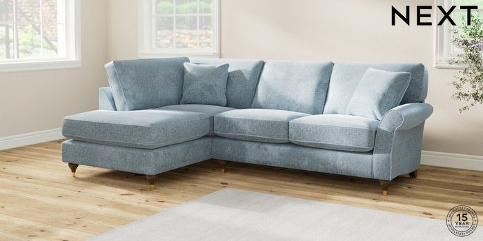 7.2.6 Buy Ashford Relaxed Sit Medium Corner Chaise - Left Hand Plush Chenille Light Blue Modern Turned Metal Cap - Mid from the Laura Ashley online shop Click here to use our website with more accessibility support, for example screen readers