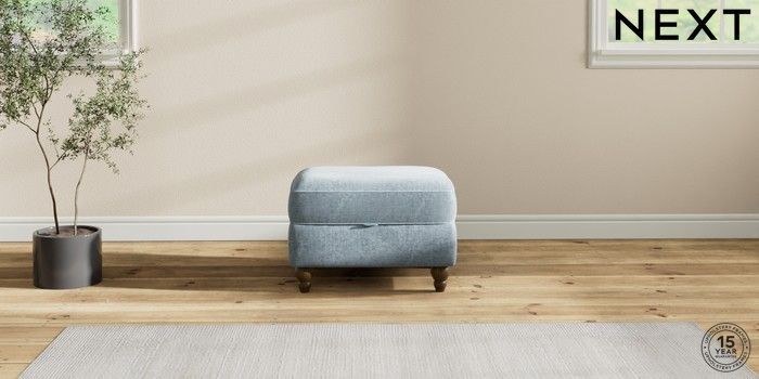 7.2.6 Buy Ashford Relaxed Sit Storage Footstool Plush Chenille Light Blue Low Turned - Mid from the Laura Ashley online shop Click here to use our website with more accessibility support, for example screen readers