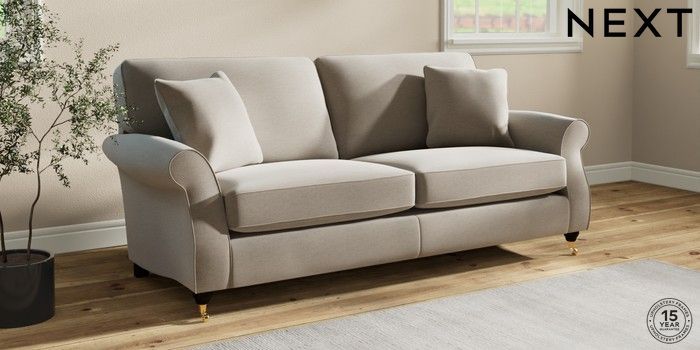 The Ashford sofa range embodies classic country style with its generous proportions and elegant scroll arms. It features ""Firmer Sit"" seat cushions, constructed with a high-density foam core and soft foam toppers. This design provides ultimate support, durability, and shape retention, while also offering a more tailored appearance. These cushions are low-maintenance and will naturally return to their shape when not in use. For extra comfort, we've included scatter cushions filled with a luxurious fibre mix. The seat cushions are also reversible, so we recommend rotating and plumping them regularly to keep them looking their best. Personalise your Ashford sofa by choosing from a vast array of fabric colors and a selection of feet options.