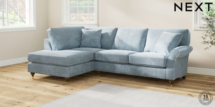 7.2.6 Buy Ashford Medium Corner Chaise - Left Hand Plush Chenille Light Blue Modern Turned Metal Cap - Mid from the Laura Ashley online shop Click here to use our website with more accessibility support, for example screen readers