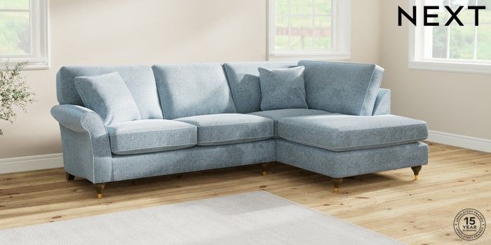 7.2.6 Buy Ashford Medium Corner Chaise - Right Hand Plush Chenille Light Blue Modern Turned Metal Cap - Mid from the Laura Ashley online shop Click here to use our website with more accessibility support, for example screen readers