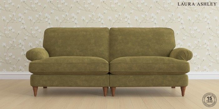 6.12.13 Buy Beaumaris by Laura Ashley 4 Seater Sofa Alwyn Velvet Olive Green Low Turned - Teak from the Laura Ashley online shop Click here to use our website with more accessibility support, for example screen readers