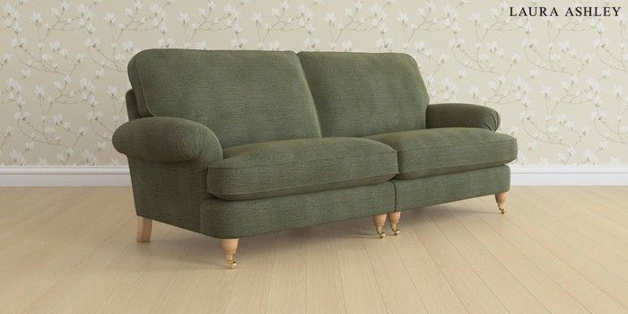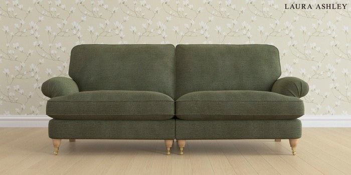 6.12.1 Buy Beaumaris by Laura Ashley 4 Seater Sofa Edwin Chenille Hedgerow Green Low Brass Castor - Light Oak from the Laura Ashley online shop Click here to use our website with more accessibility support, for example screen readers