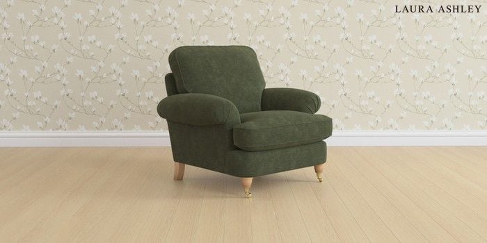 6.12.1 Buy Beaumaris by Laura Ashley Armchair Alwyn Velvet Ivy Green Low Brass Castor - Light Oak from the Laura Ashley online shop Click here to use our website with more accessibility support, for example screen readers