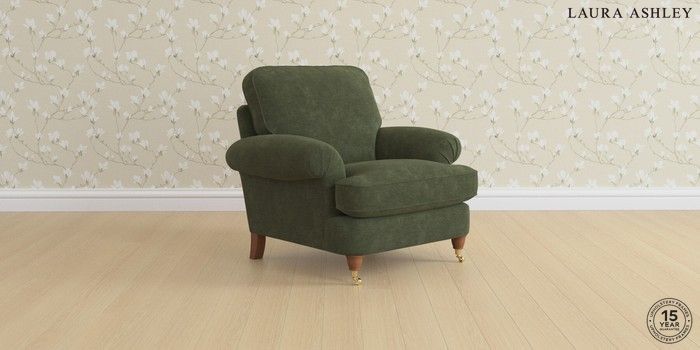 6.12.1 Buy Beaumaris by Laura Ashley Armchair Alwyn Velvet Ivy Green Low Brass Castor - Teak from the Laura Ashley online shop Click here to use our website with more accessibility support, for example screen readers