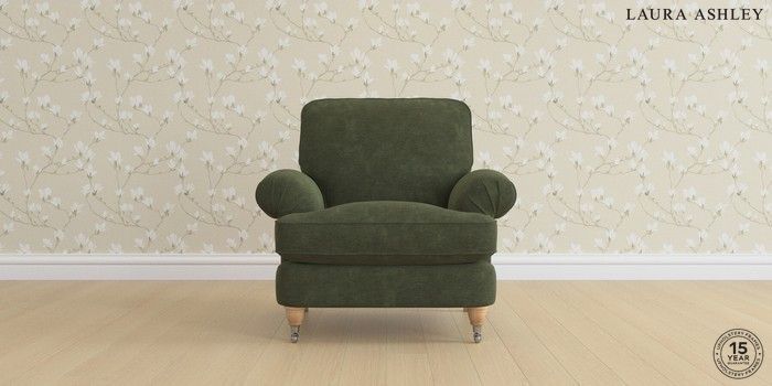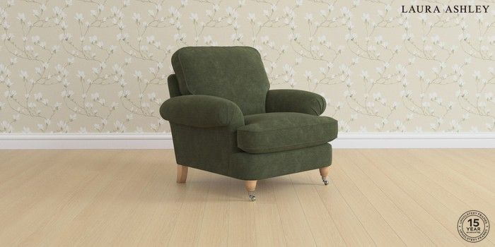 6.12.1 Buy Beaumaris by Laura Ashley Armchair Alwyn Velvet Ivy Green Low Chrome Castor - Light Oak from the Laura Ashley online shop Click here to use our website with more accessibility support, for example screen readers